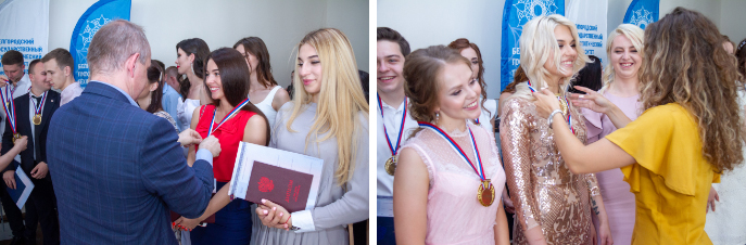 Трогательным моментом мероприятия стало преподнесение бакалаврам фирменных поздравительных памятных медалей "Выпускник кафедры ЭУН 2019 г."